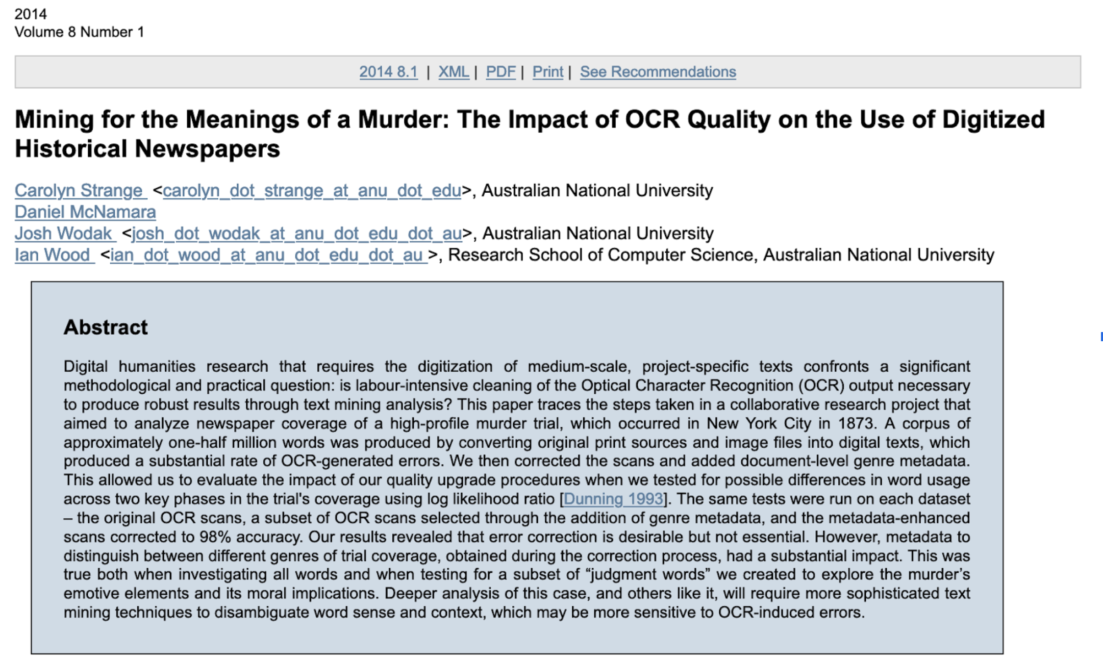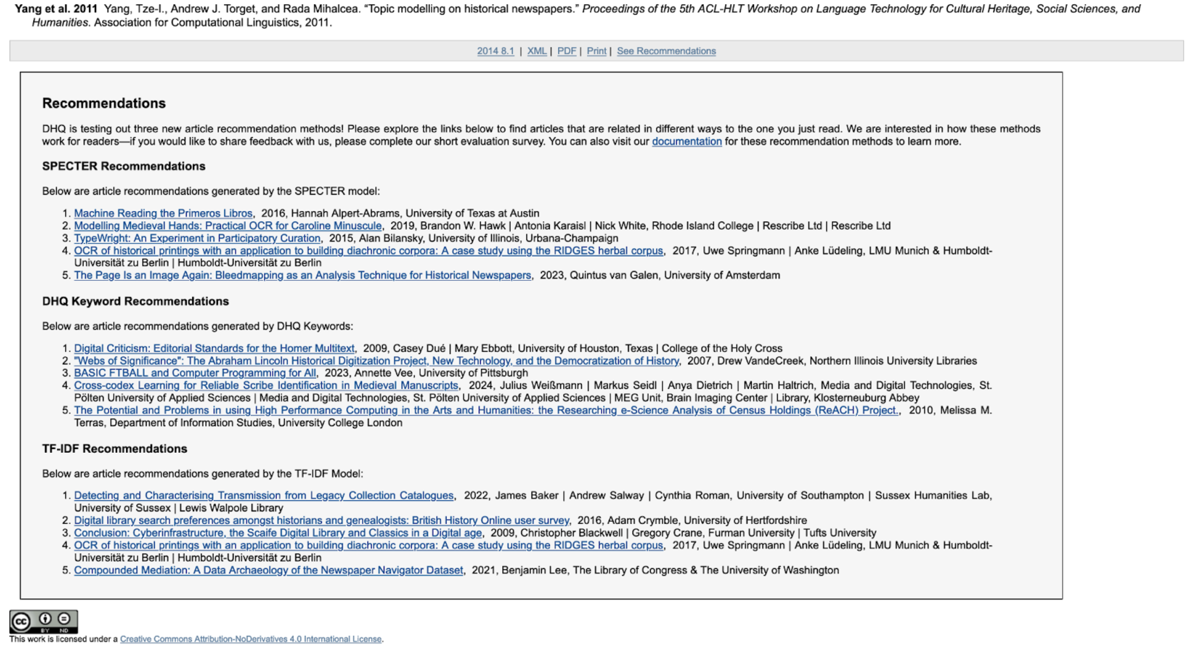 The above figures show how this is implemented within a DHQ article: A “See Recommendations” button was placed at the top of the toolbar (Figure 1) that brings the user down to the bottom of the page with the recommendations from each of the three recommendation systems, as well as the explanatory text (Figure 2). Note that the recommendations are mostly varied from one system to another, touching on aspects of the article such as technical methodology in OCR and archival medium in historical newspapers. Recommendations in this example also range from the entirety of DHQ’s publication history. Note further that Figure 2 shows the descriptive text surrounding the recommendation methods for the end-user, which also links to a more in-depth description page for the end-user to learn more if desired.